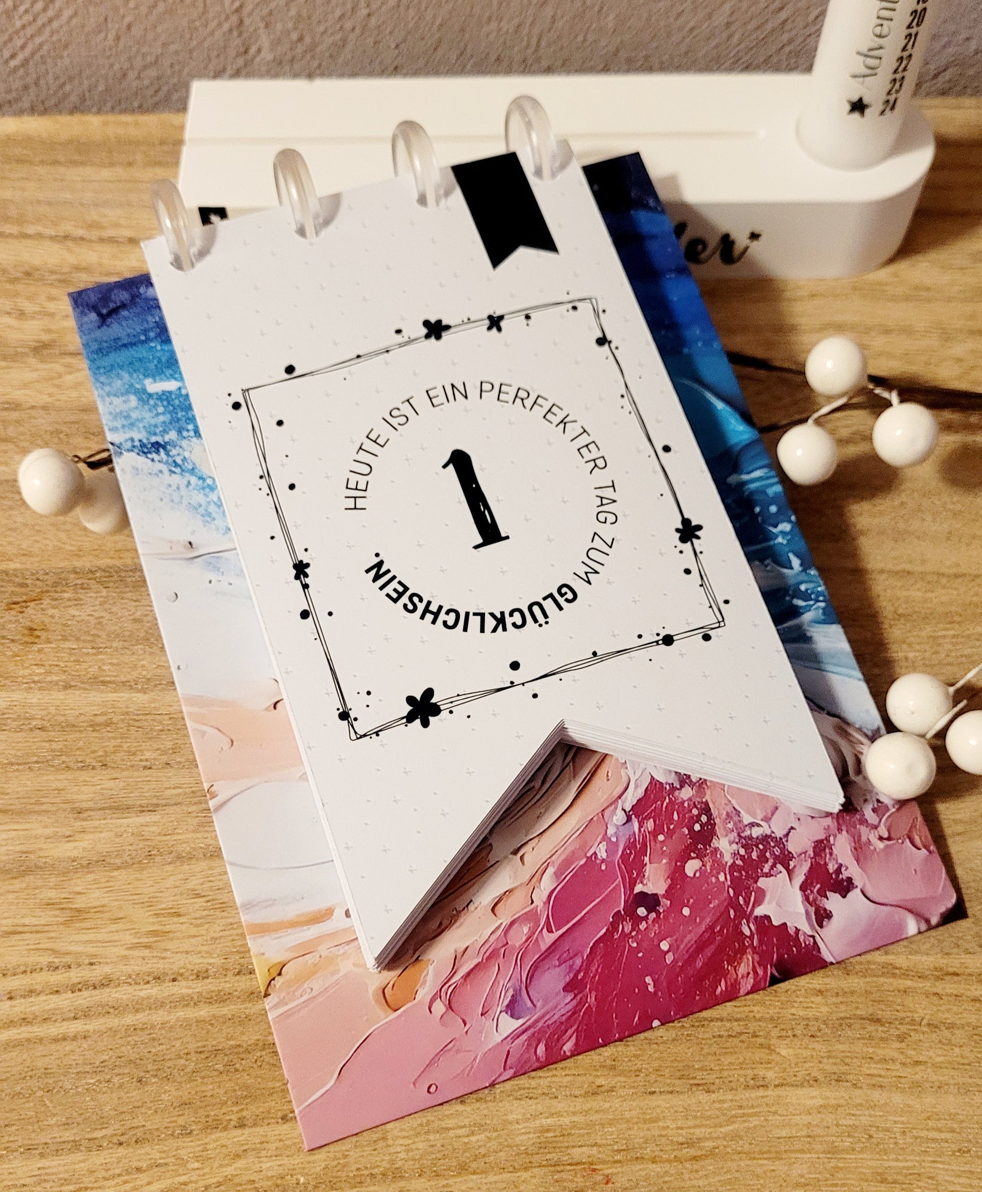 Stilvoll und liebevoll angefertigt ist der Adventskalender aus Papeterie mit 24 Wimpelseiten und schönen Sayings. Der Kalender ist anhand der Bindediscs zum blättern funktioniert. Ein edler Button ziert die Front des Kalenders. Dank des gegossenen Aufstellers kommt der Kalender schön zur Geltung und findet somit zum Beispiel auf einem Tisch seinen Platz. Eine 18cm Stabkerze ist passend zur Adventszeit veredelt.