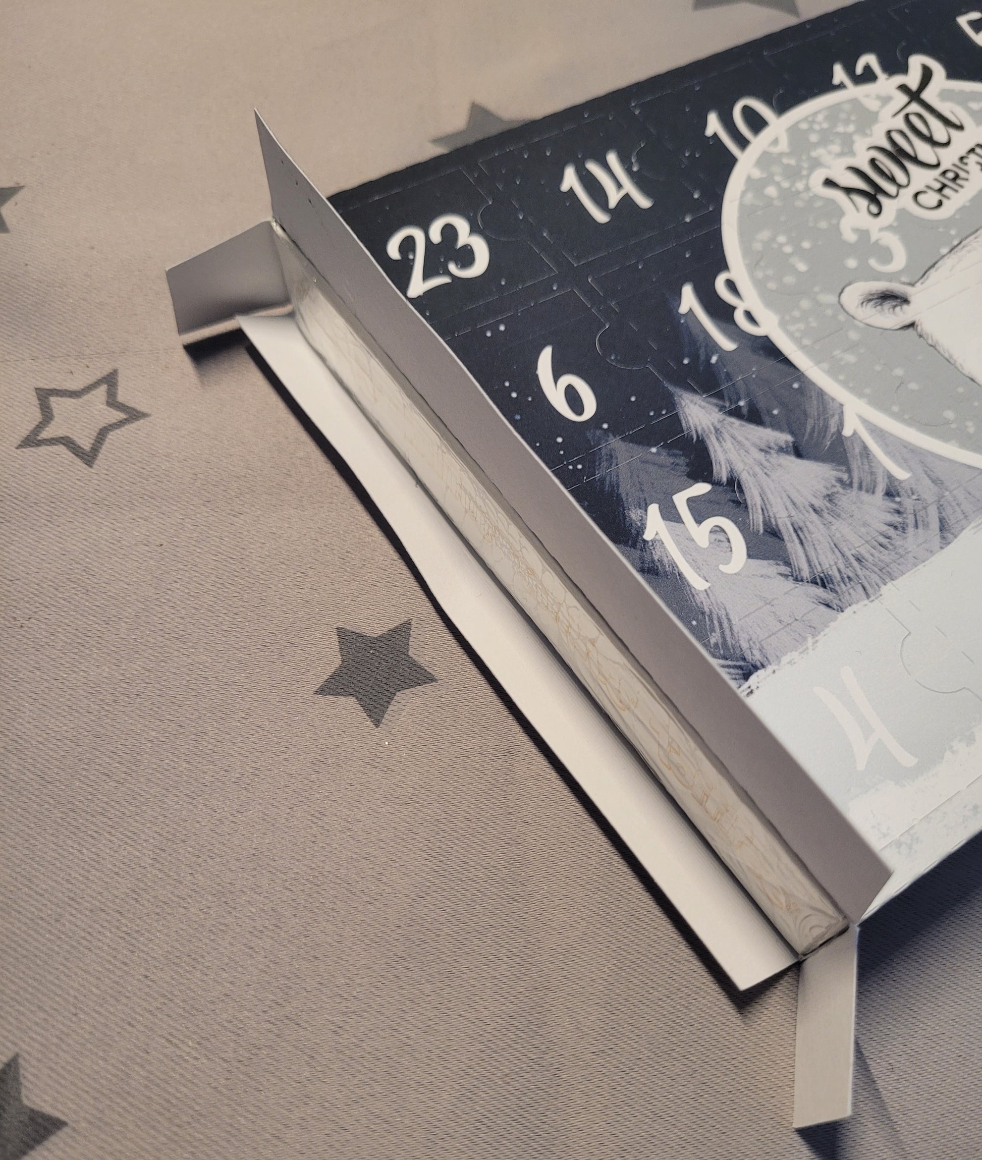 Variante 3: mit 24 Fächern zum selber befüllen. Fachgröße in etwa wie eine Kugel Rocher, siehe Beispielbild. Das zu befüllende Kalenderinnenteil schiebst du dann nach dem befüllen in das Außenteil und klebst die Seitenlaschen zu.