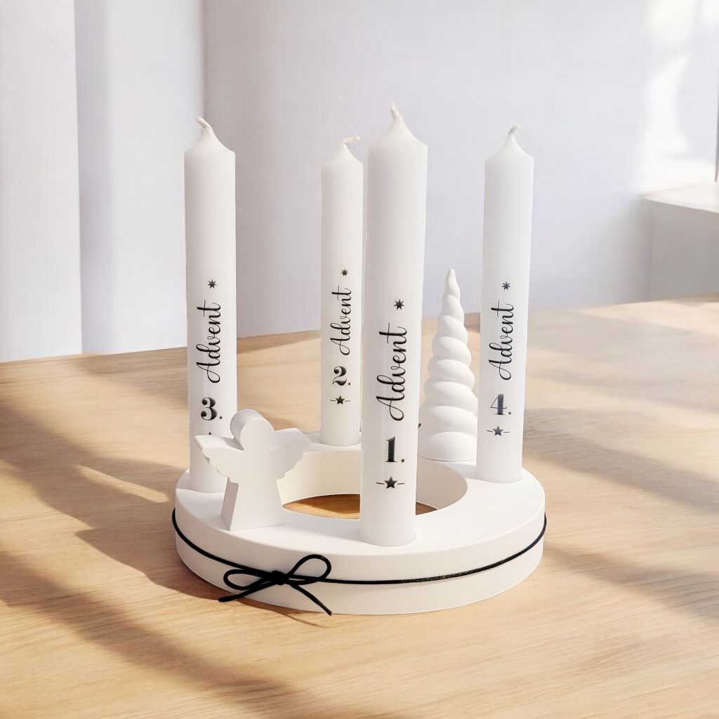 4 weiße Kerzen (je18 cm) sind im Set enthalten. Diese sind nach Wahl veredelt. Bitte wähle deine Wunschkerzen in den Optionen aus.