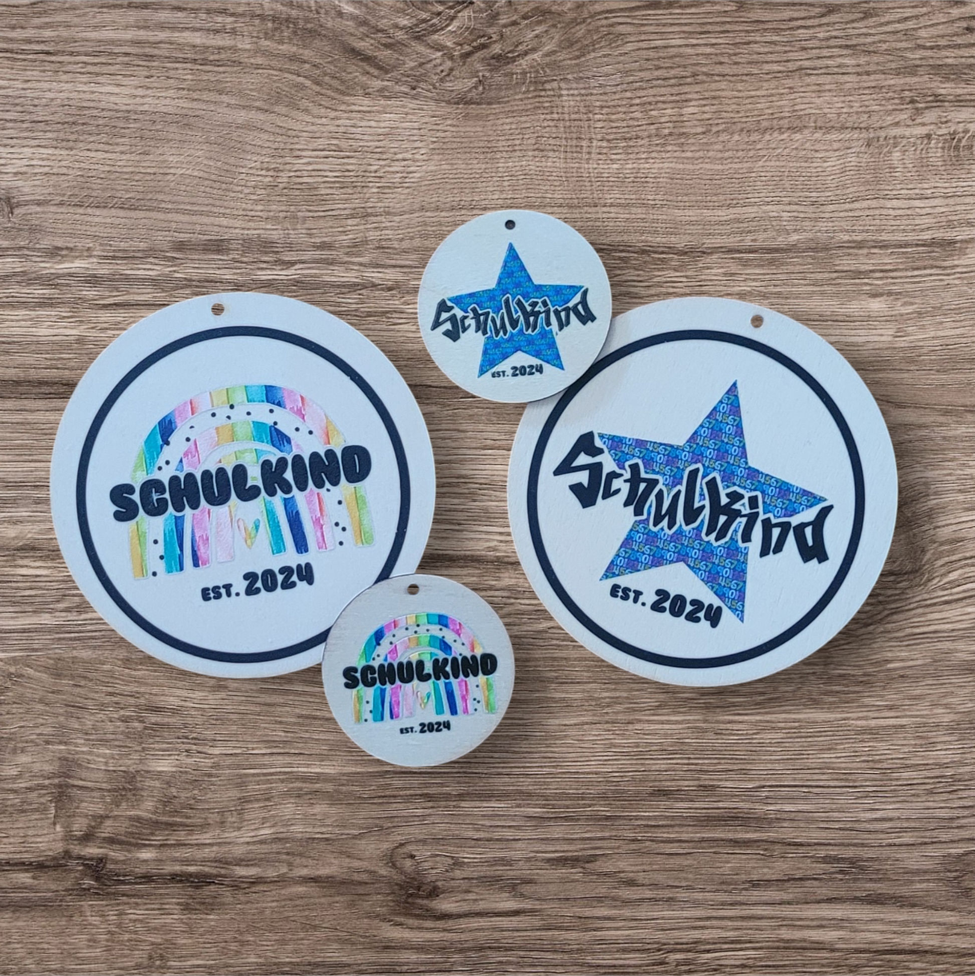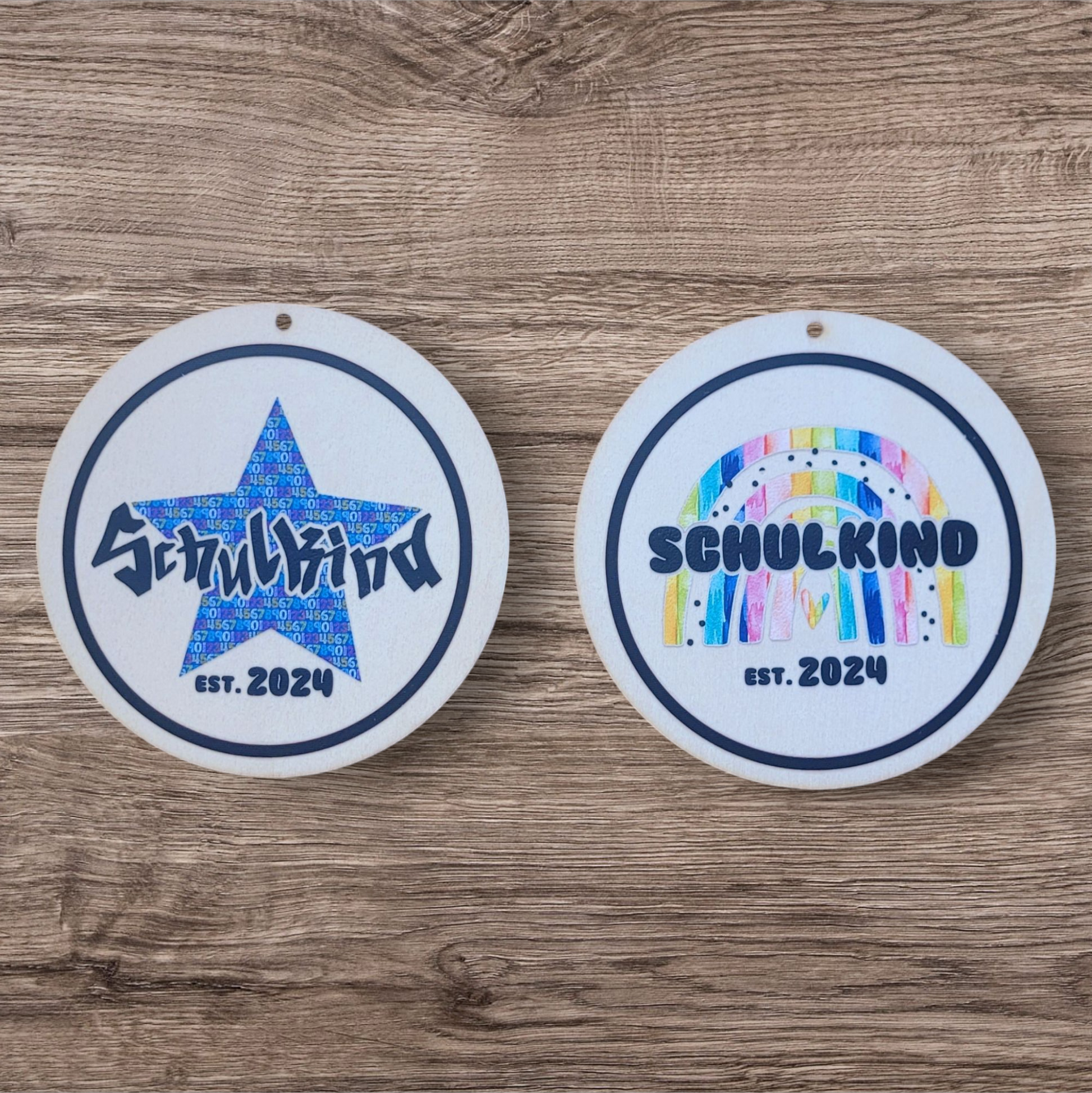 Runde Anhänger aus Holz, veredelt mit 2 unterschiedlichen Schulkind Motiven.