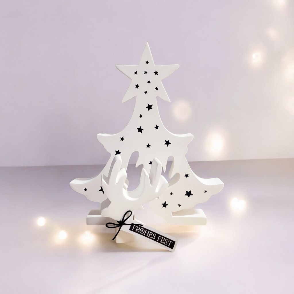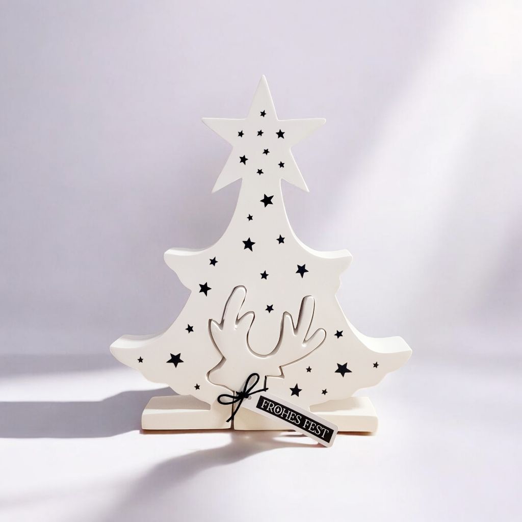 Veredelt ist der Baum mit kleinen schwarzen Sternen, der Hirsch trägt ein Statment Anhänger "Frohes Fest" umgebunden.