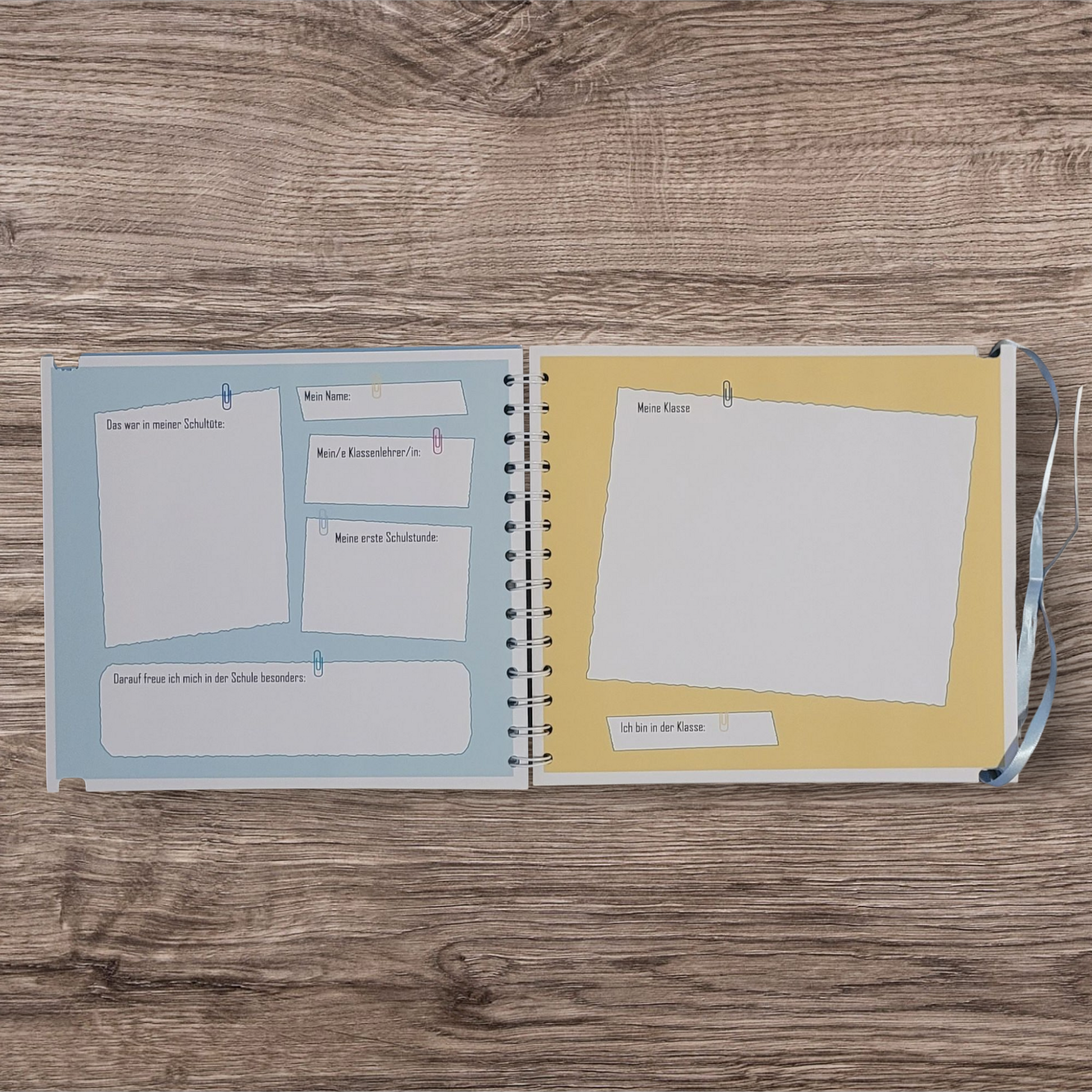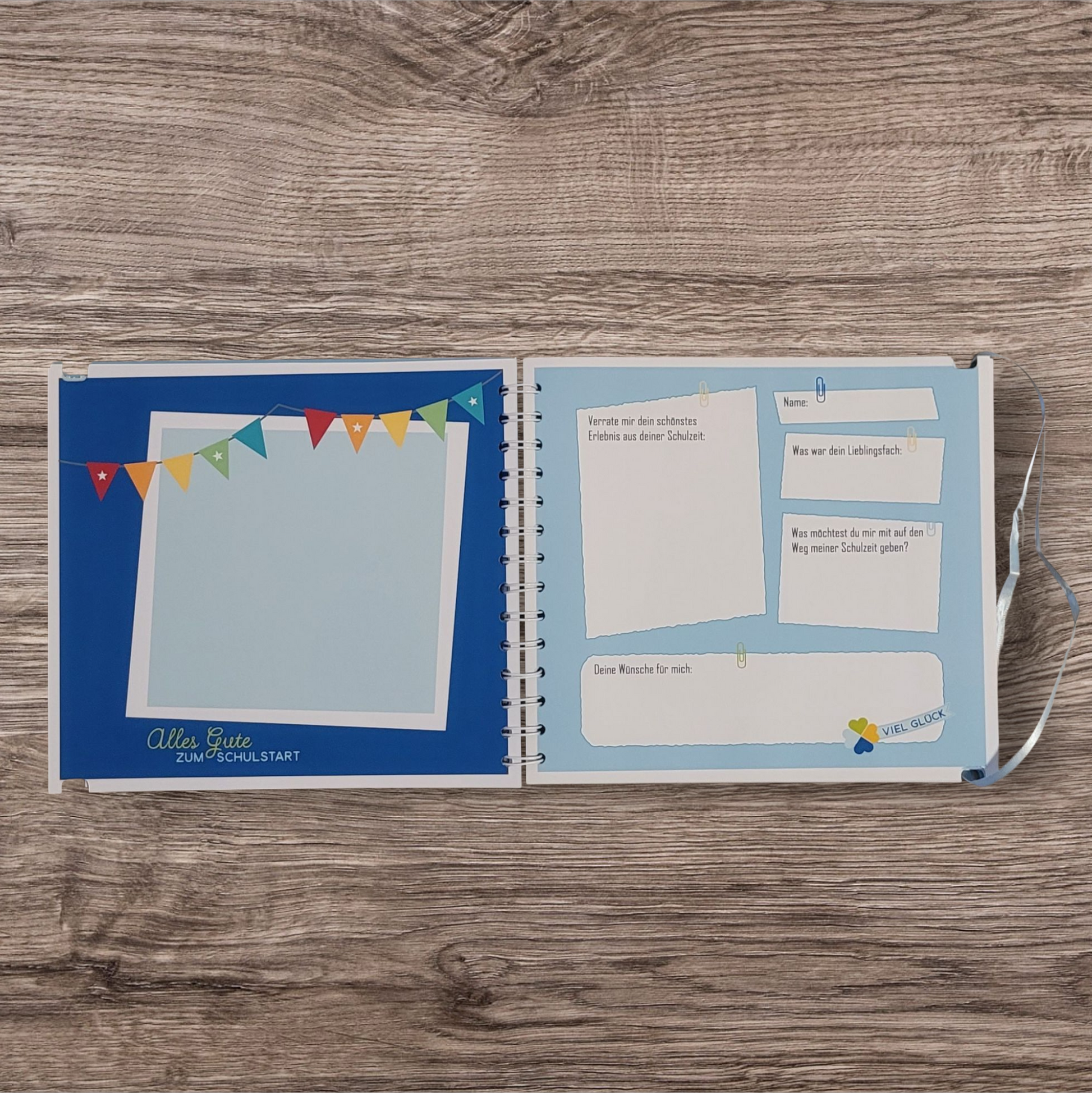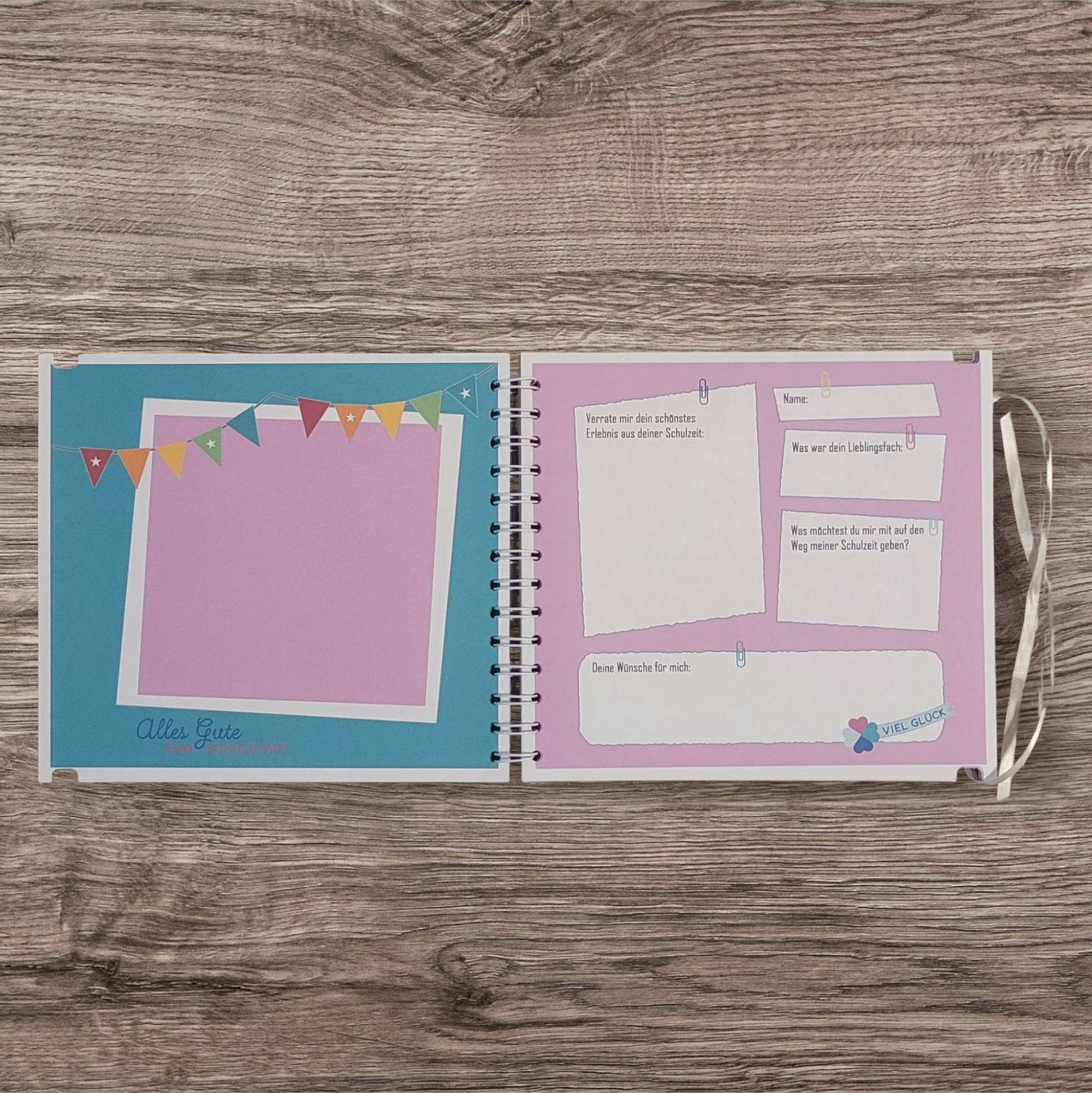 Es findet sich Platz für ein Einschulungsfoto, ein Klassenfoto, das Schulkind darf selber etwas ausfüllen und anschließend folgen Doppelseiten für die Gäste mit Platz für ein Foto sowie Zeilen an das Schulkind.