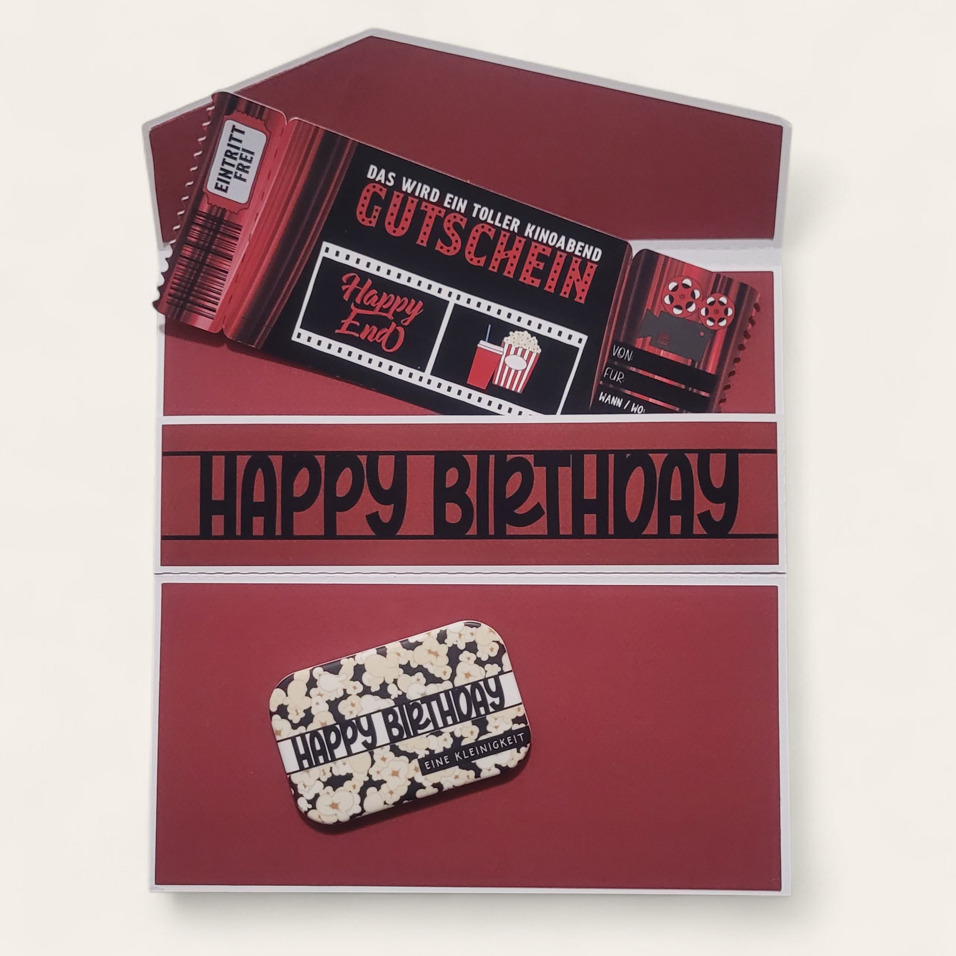 Die Umschlagkarte ist aufklappbar, im Inneren ist noch Platz für ein paar handgeschriebene Zeilen. Sie ist aus stabilem Tonpapier liebevoll angefertigt. Das Kinoticket kann noch per Hand personalisiert werden und kommt in den Einschieber.