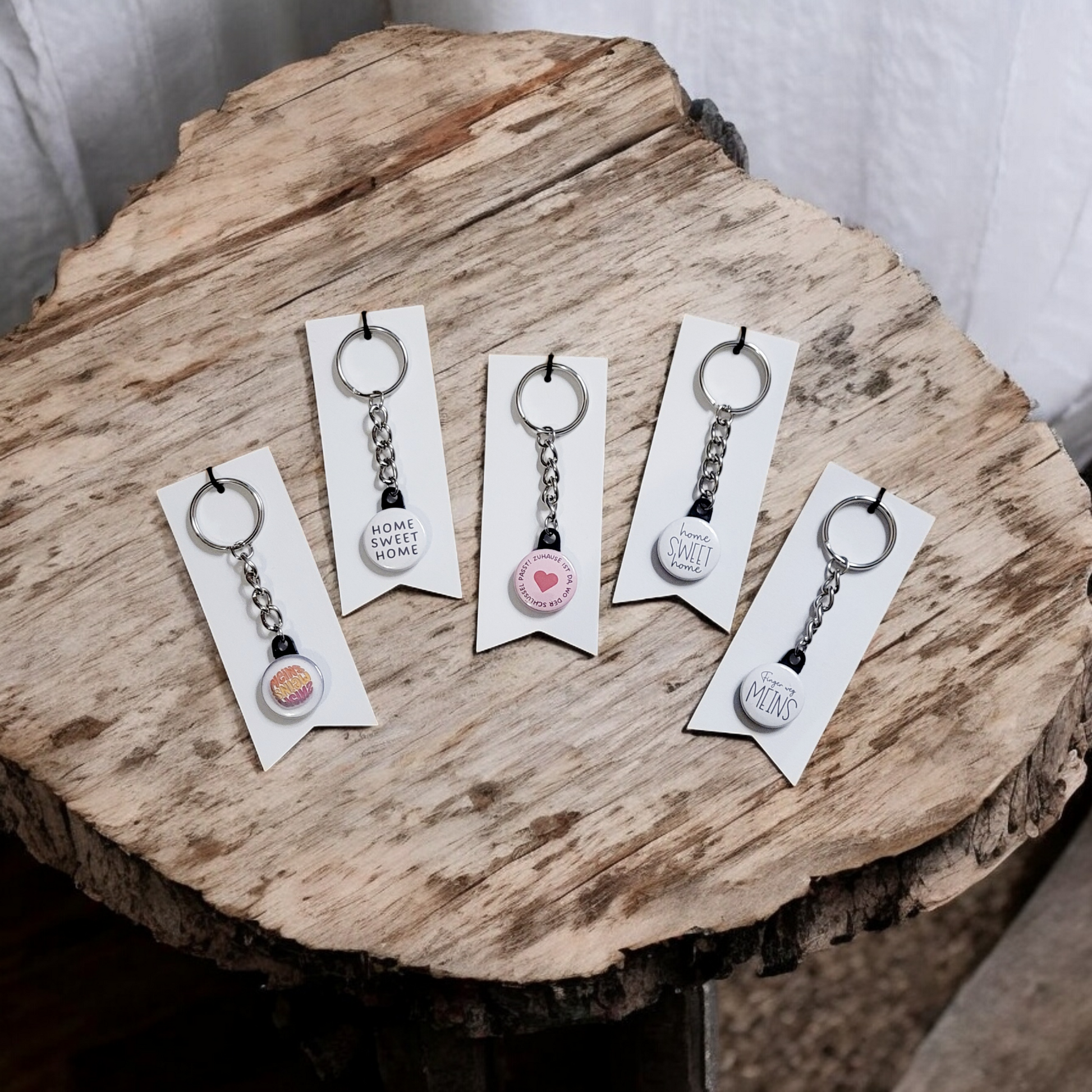 Stylische Schlüsselanhänger mit coolen Statement Button veredelt.